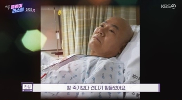힘든 무명생활을 어렵게 버텼던 진성에게 드디어 좋은 소식만 들려오는 듯했으나 급작스러운 혈액암 판정과 함께 심장 판막증 진단을 받게 되면서 모든 활동을 접고 투병 생활을 하게 되었습니다. 진성은 "병원에 갔는데 의사 선생님이 '암입니다' 그 뒷 얘기는 필요 없다. '암입니다'라는 얘기만 들었을 때 혼이 나갔다"며 "힘들었다. 죽음의 사선까지 갔었다"고 고백했습니다.